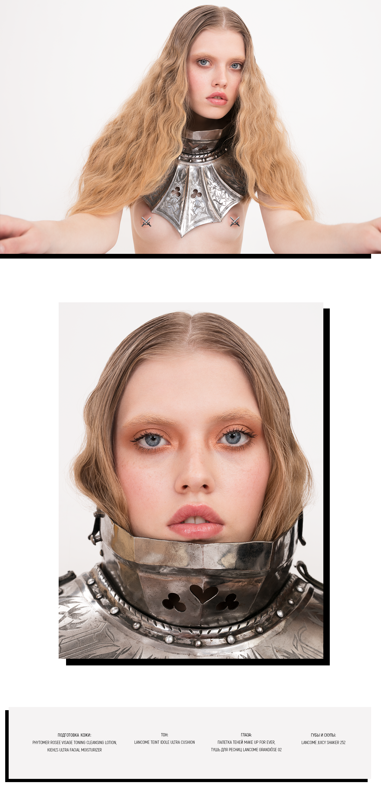 Воинственные девы с алой, как кровь, помадой, пылающими щеками и глазами цвета неба в новой съемке TWIN PICS и Beauty Advisor, созданной при поддержке Lancome.